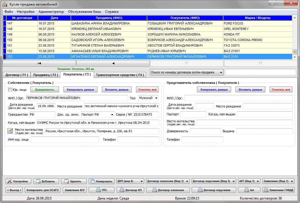 После запуска приложения пользователь получает доступ к главному интерфейсу с панелями управления, формами ввода данных и инструментами поиска. Добавление нового договора начинается с заполнения информации о продавце и покупателе, после чего вводятся данные о транспортном средстве: марка, модель, VIN, год выпуска, тип двигателя и другие параметры. Программа автоматически подставляет экологический класс и поддерживает электрические двигатели. При вводе VIN система может предложить ранее внесённые данные, если таковые есть в базе. Далее формируется договор, который можно редактировать перед печатью, включая поля для особых отметок в ПТС. Поддерживаются операции с юридическими лицами, доверенными лицами и безналичными расчётами. Все документы можно сохранить в базе, экспортировать в Excel или распечатать в нужном формате. Поиск по базе осуществляется по номеру договора, дате, ФИО сторон или госномеру. В настройках можно задать путь к базе данных, включить резервное копирование и настроить печать с учётом НДС.