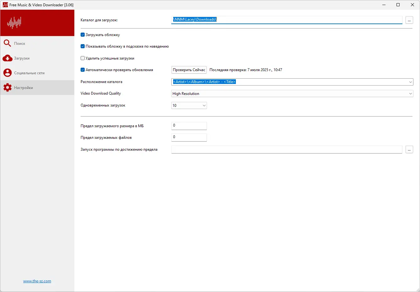 Использование Lacey не требует специальных навыков. После запуска приложения пользователь вводит поисковый запрос или вставляет ссылку на нужный ролик или трек. Программа анализирует источник, определяет доступные форматы и качества, после чего начинает загрузку. В настройках можно указать папку для сохранения, ограничить количество одновременных процессов, выбрать разрешение видео и битрейт аудио. Также доступна опция автоматической сортировки по папкам и загрузка обложек в формате JPEG. Для расширения поиска можно вручную активировать дополнительные ресурсы через выпадающий список рядом с иконками сайтов. При достижении заданных лимитов программа может запускать указанный исполняемый файл, что полезно для автоматизации задач.