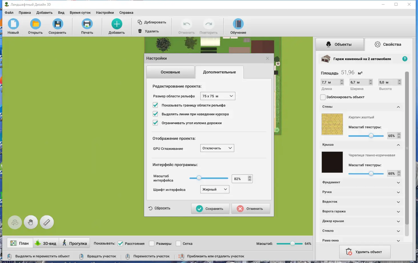 - Позволяет задавать точные габариты участка с возможностью корректировки до сантиметра и выбором покрытия — от газона до щебня.