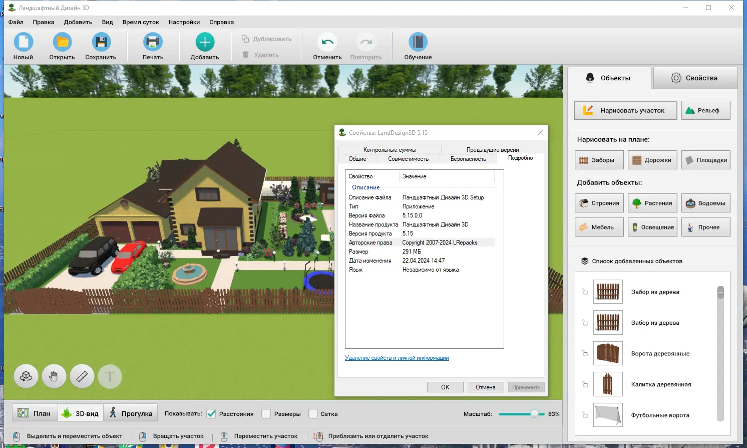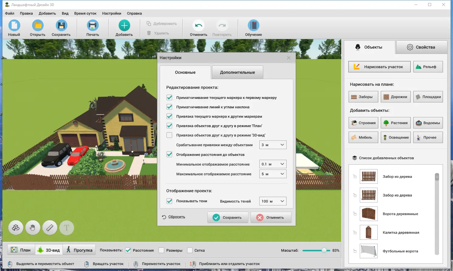 - Богатый каталог объектов: дома, заборы, мебель, освещение, детские площадки и мангалы