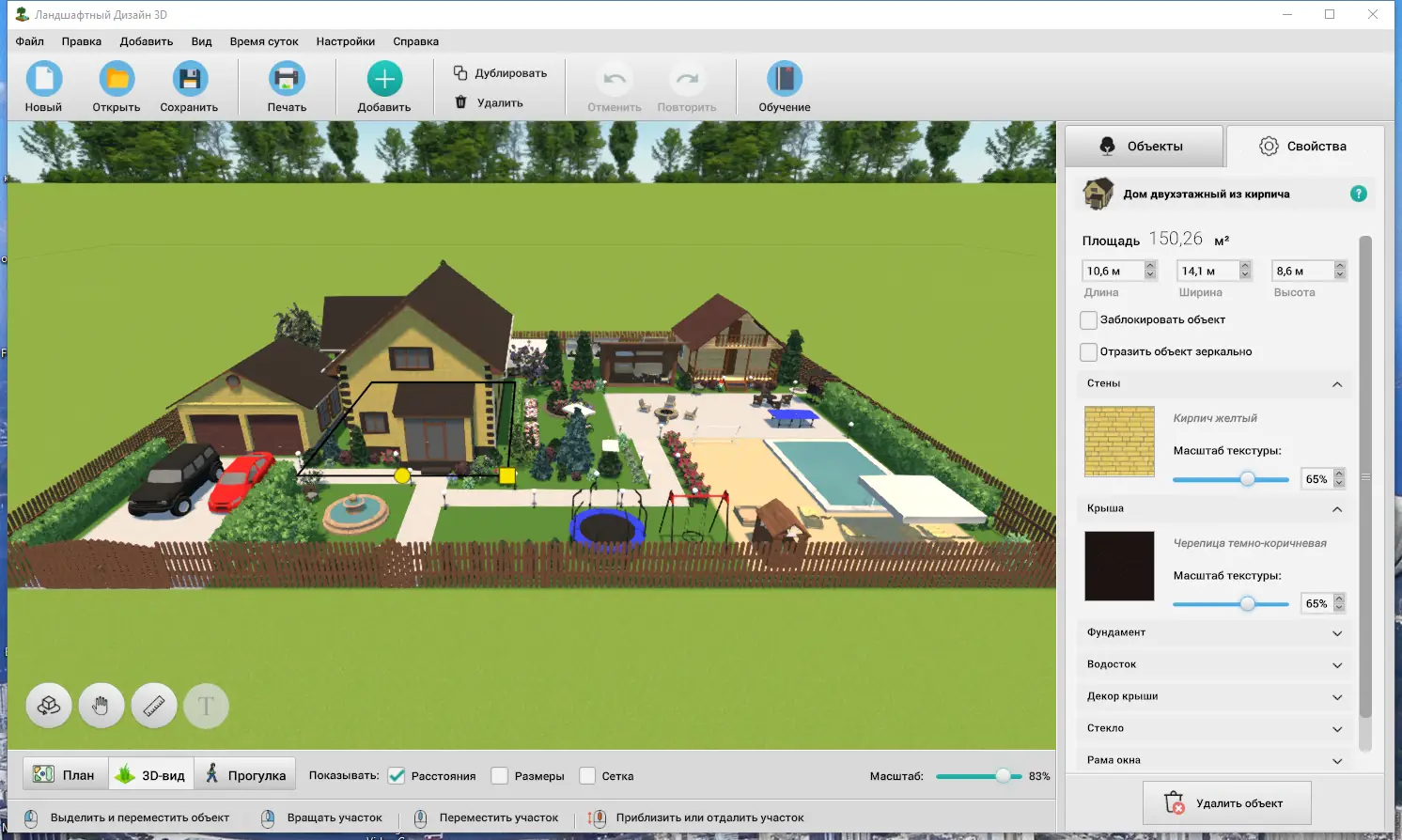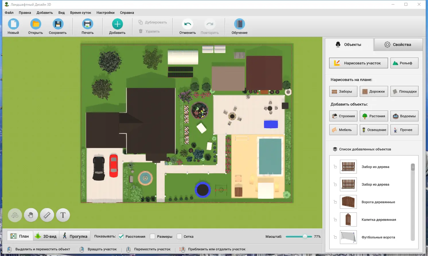 Работа с программой начинается с создания контура участка, который можно вытягивать и редактировать вручную. Далее из каталога выбираются объекты — дом, беседка, клумба или фонари — и размещаются в нужных точках. Каждый элемент поддаётся детальной настройке: высота, ширина, угол поворота, текстура. Например, можно изменить расстояние между столбами забора или подобрать подходящий оттенок для дорожки. После завершения компоновки проект можно посмотреть в 3D-режиме, оценив, как будет выглядеть участок утром, днём или вечером при искусственном освещении. Готовый план легко распечатать или сохранить на компьютере для последующего редактирования.