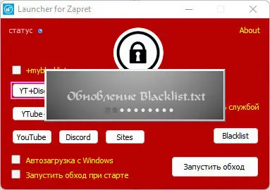 Использование программы не требует глубоких технических знаний. Для начала работы необходимо выбрать версию комплекта — x86 или x64 — в зависимости от разрядности установленной операционной системы. После этого запускается основной исполняемый файл Launcher for Zapret, который инициирует процесс zapret с выбранным по умолчанию профилем. Переключение между режимами, такими как YT+Dc или YouTube+Sites, осуществляется прямо из контекстного меню в системном трее, что позволяет оперативно адаптировать соединение под текущие задачи. Кнопка обновления blacklist синхронизирует локальный список с актуальной версией с ресурса Antizaprert, гарантируя, что новые домены не останутся заблокированными. В версии 1.4 была улучшена работа автозапуска, а в 2.8 реализованы оптимизации, повысившие стабильность фоновой работы. Версия 2.9 принесла дополнительные исправления, касающиеся отображения иконки и логики сворачивания окна.