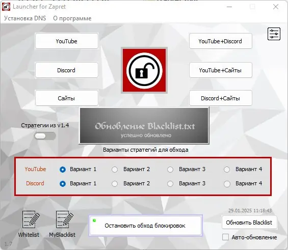Наличие нескольких стратегий обхода делает Launcher for zapret универсальным решением для разных сценариев использования