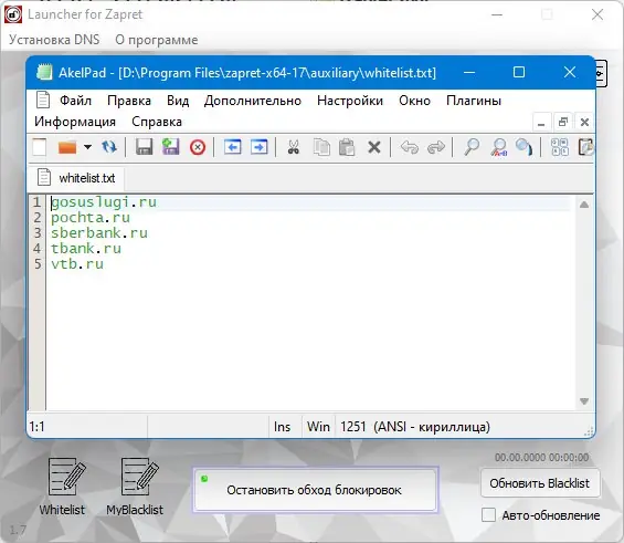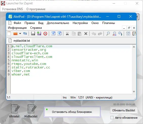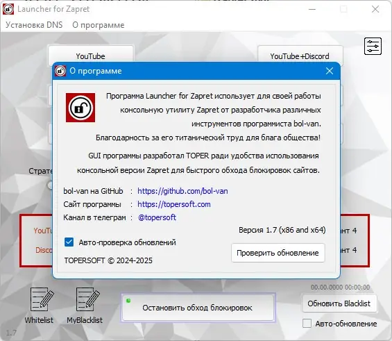 - Поддерживает предустановленные профили для YouTube, Discord и других заблокированных сервисов из файла blacklist.txt