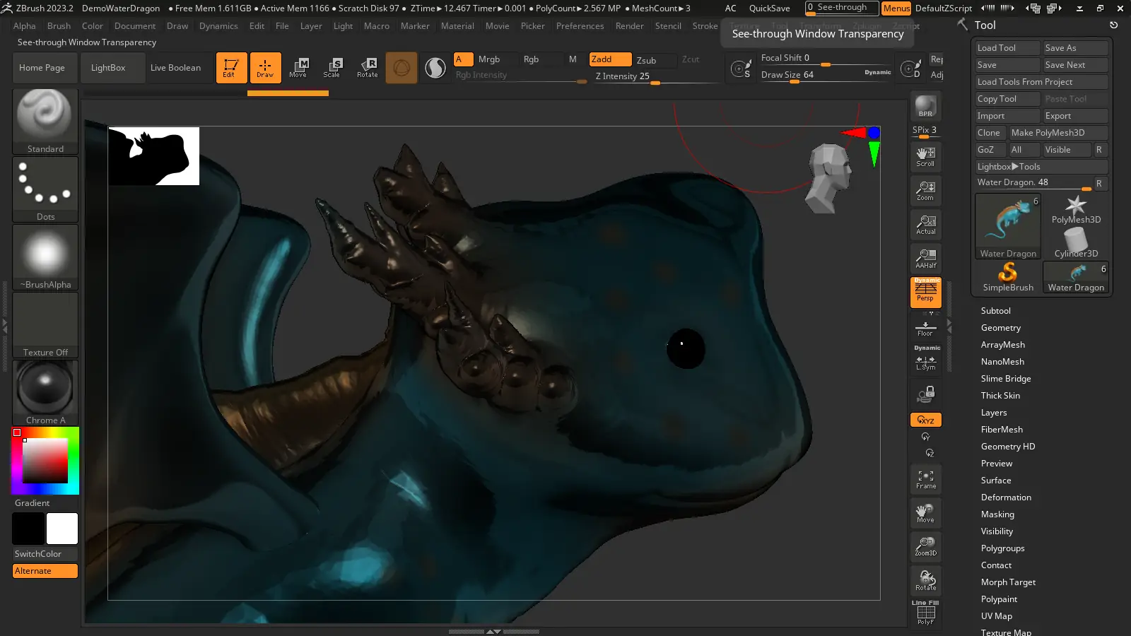 - Режим DynaMesh, обеспечивающий динамическое перераспределение геометрии во время лепки.