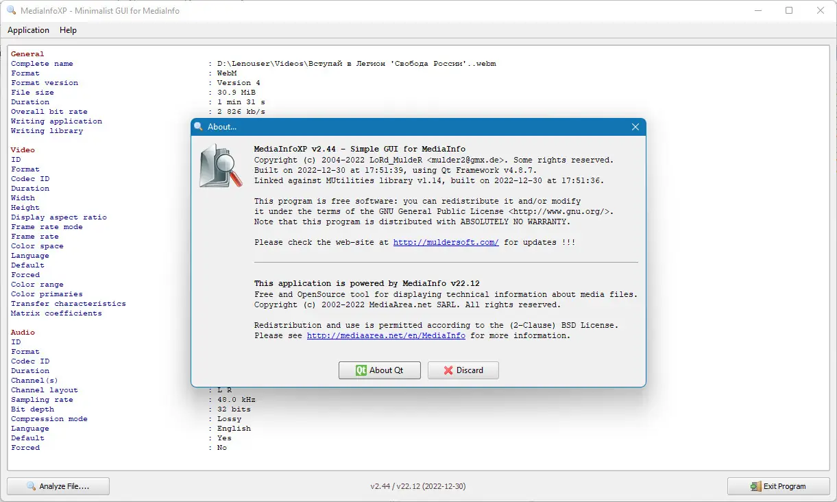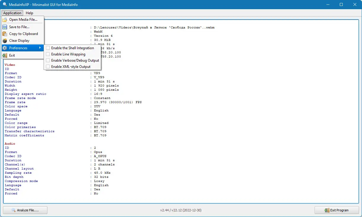 MediaInfoXP — бесплатная портативная утилита с открытым исходным кодом, предназначенная для анализа технических параметров аудио- и видеоматериалов. Программа предоставляет детальную информацию о кодеках, битрейтах, разрешении, длительности и других характеристиках медиафайлов.