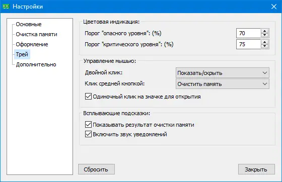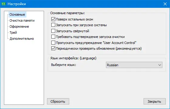 Использование программы не требует глубоких технических знаний. После запуска отображается текущее состояние оперативной памяти, включая объём, доступный и используемый. Пользователь может инициировать очистку вручную или настроить автоматическое выполнение по таймеру. Двойной клик по значку в трее можно привязать к запуску очистки без дополнительных подтверждений. Все параметры, включая частоту обновления данных, методы очистки и поведение интерфейса, настраиваются через встроенные опции.