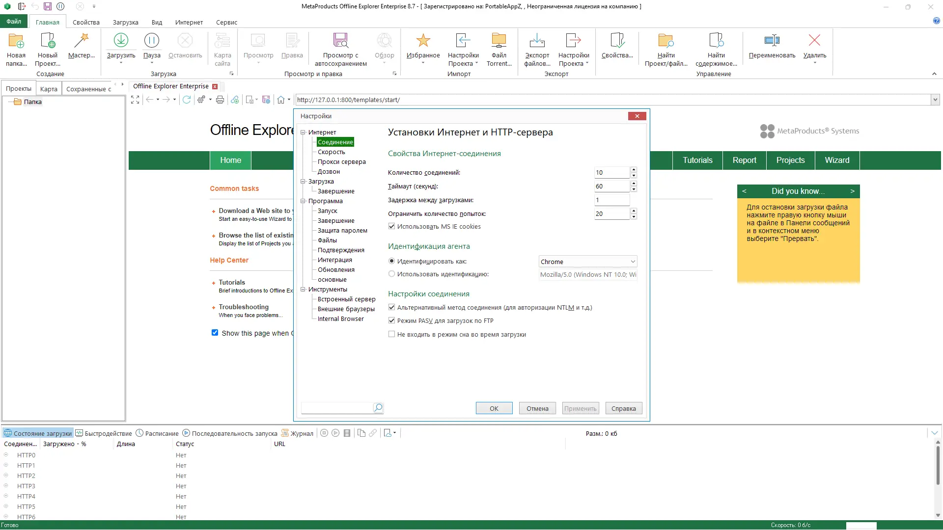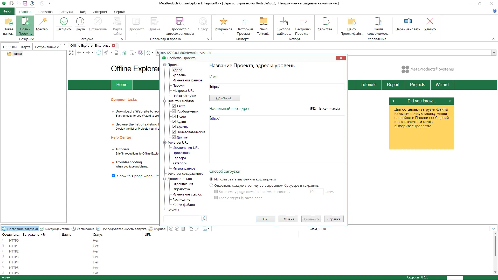 MetaProducts Offline Explorer — универсальное решение для скачивания веб-сайтов и отдельных файлов по протоколам HTTP, FTP и HTTPS. Программа предназначена для создания полных локальных копий интернет-ресурсов с сохранением структуры, ссылок и мультимедийного контента. Благодаря поддержке современных технологий, включая JavaScript, CSS и динамические страницы, сохранённые сайты остаются полностью функциональными в автономном режиме.