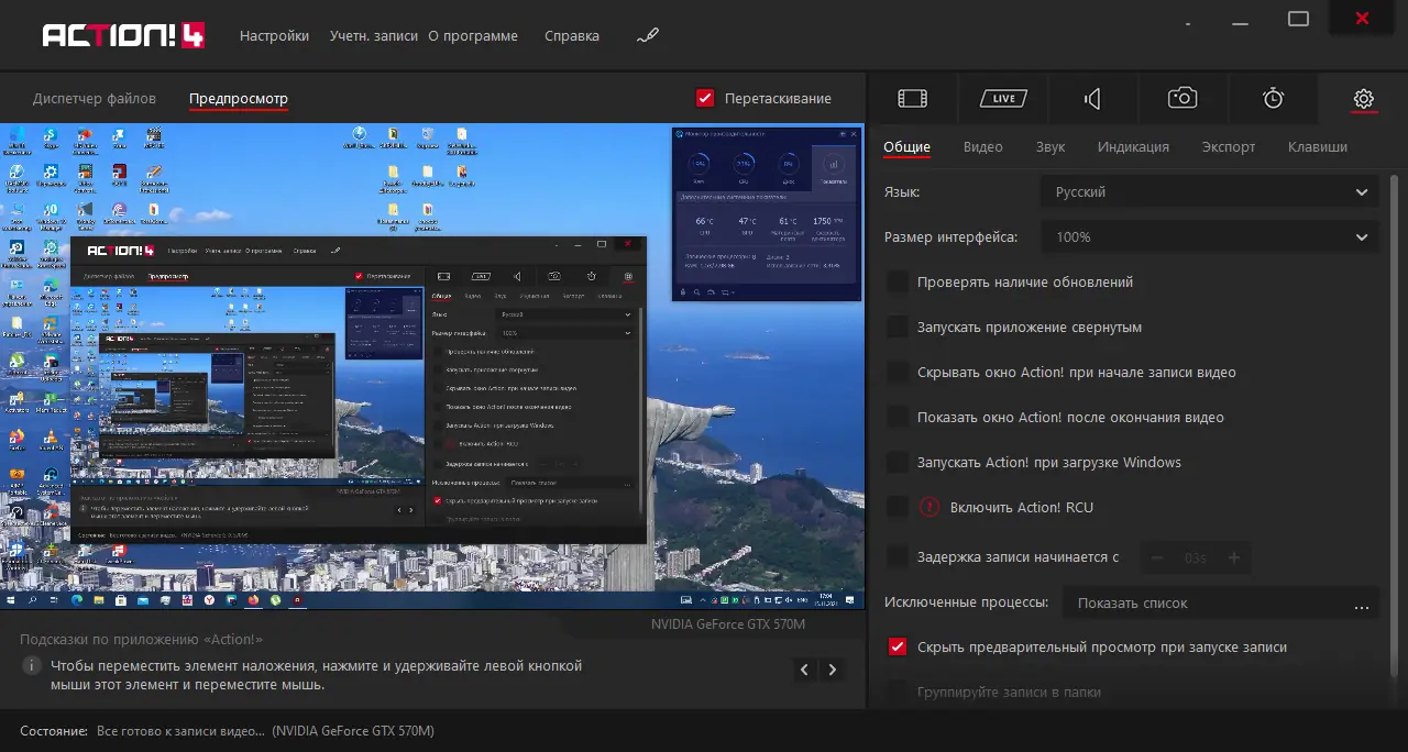 Mirillis Action разработана для захвата экрана с акцентом на производительность и качество. Программа эффективно использует аппаратное ускорение, что позволяет записывать видео без просадок в играх. Благодаря оптимизированному движку, загрузка процессора и видеокарты остаётся на минимальном уровне, что особенно важно во время интенсивных сессий. Пользователь может выбрать нужный источник видео: весь экран, отдельное окно или определённую область. Поддержка формата H.264 позволяет сохранять файлы в MP4 без дополнительной конвертации, экономя место и время. Также доступна запись звука с микрофона и веб-камеры, что удобно для создания обзоров и стримов.