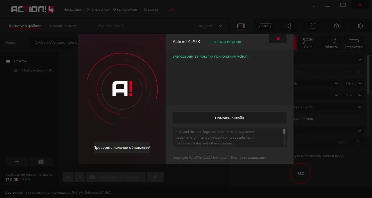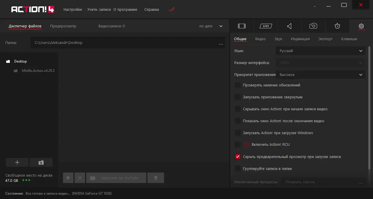 Работа с Mirillis Action