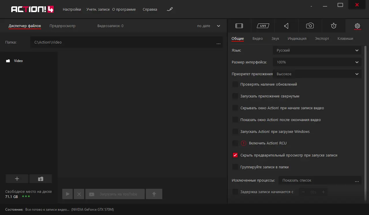 Интерфейс Mirillis Action интуитивно понятен: после запуска достаточно выбрать источник захвата — весь экран, отдельное окно или игровое приложение. Настройки позволяют задать разрешение, частоту кадров, уровень сжатия и аудиовход. Перед началом записи можно активировать таймер, включить курсор мыши в трансляцию и назначить горячие клавиши для управления процессом. После завершения программа автоматически обрабатывает файл и предлагает опции экспорта или загрузки.