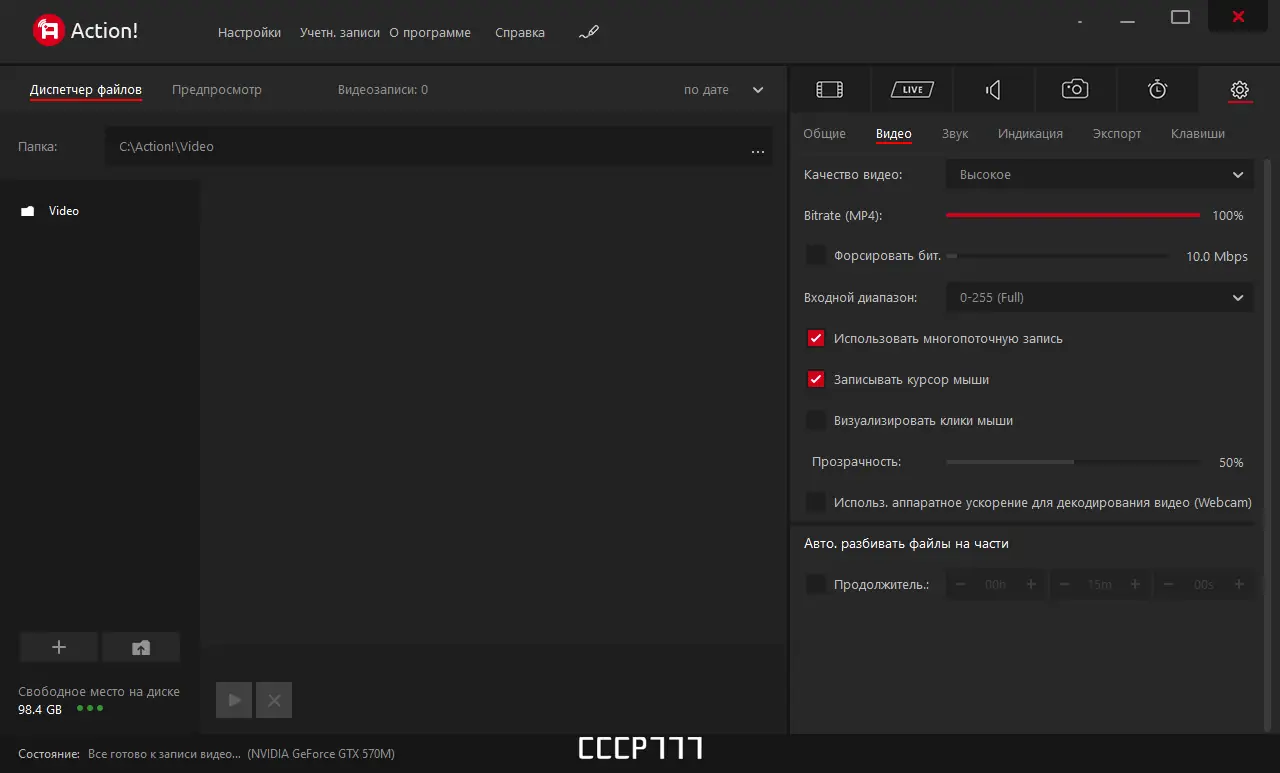 Mirillis Action обеспечивает стабильную запись видео с экрана монитора, включая запуск игр, приложений и рабочего стола. Программное обеспечение использует оптимизированный движок, позволяющий снимать видео с частотой до 120 кадров в секунду без заметного падения FPS в играх. Благодаря поддержке аппаратного ускорения видеокарт NVIDIA, AMD и Intel, нагрузка на центральный процессор сводится к минимуму, что особенно важно при одновременной работе с тяжелыми приложениями.