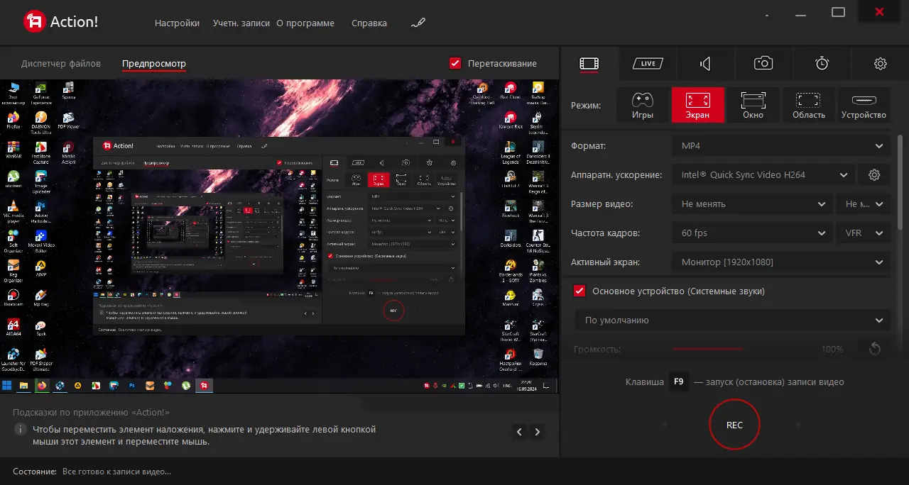 Mirillis Action разработана специально для высококачественной записи экрана в реальном времени, особенно в условиях интенсивной графической нагрузки, каковой является игровой процесс. Программа использует технологию аппаратного ускорения, что позволяет снижать нагрузку на центральный процессор и видеокарту, сохраняя при этом чёткое и плавное изображение. Благодаря поддержке частоты до 120 кадров в секунду, запись выглядит максимально естественно и подходит для профессионального монтажа или трансляций.