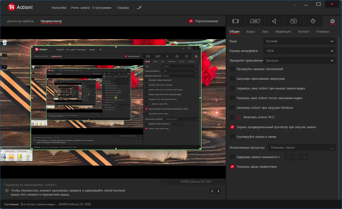 Mirillis Action — это мощное программное обеспечение для записи экрана, ориентированное в первую очередь на геймеров и создателей видеоконтента. Программа позволяет фиксировать игровой процесс с высокой частотой кадров — до 120 fps — обеспечивая плавное и качественное видео. Благодаря оптимизированному движку, запись осуществляется с минимальной нагрузкой на центральный и графический процессоры, что особенно важно при одновременной игре и трансляции.