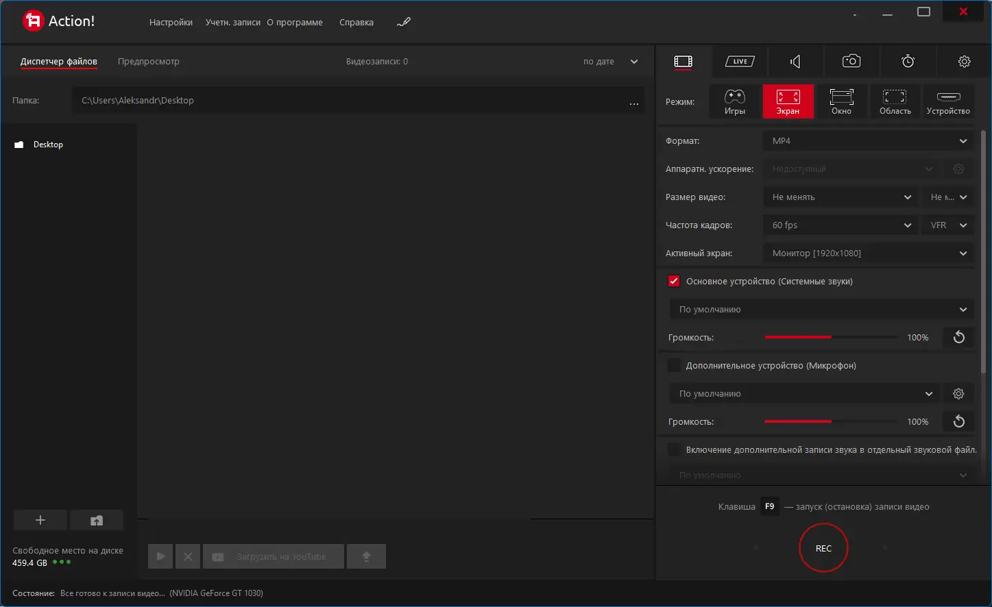 - Запись в современный формат MP4 с использованием кодека H.264, обеспечивающего высокое качество при малом размере файла.