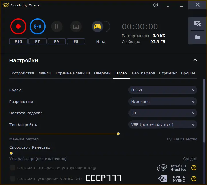 - Запись видео с экрана с частотой до 60 кадров в секунду