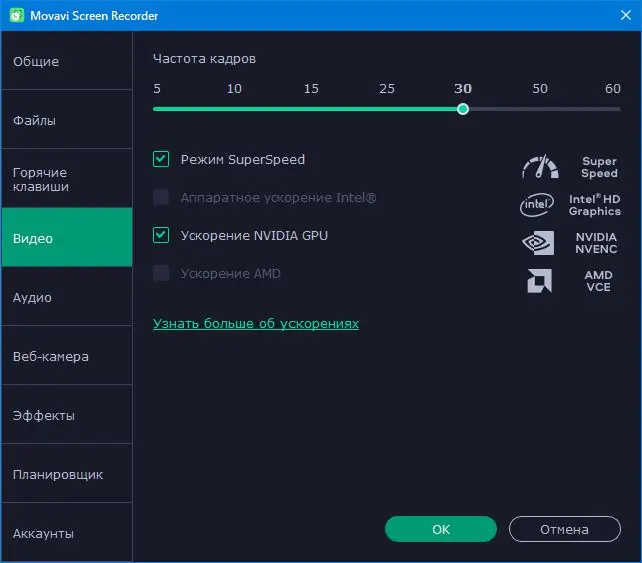 - Запись видео с экрана в высоком качестве с настройкой частоты кадров