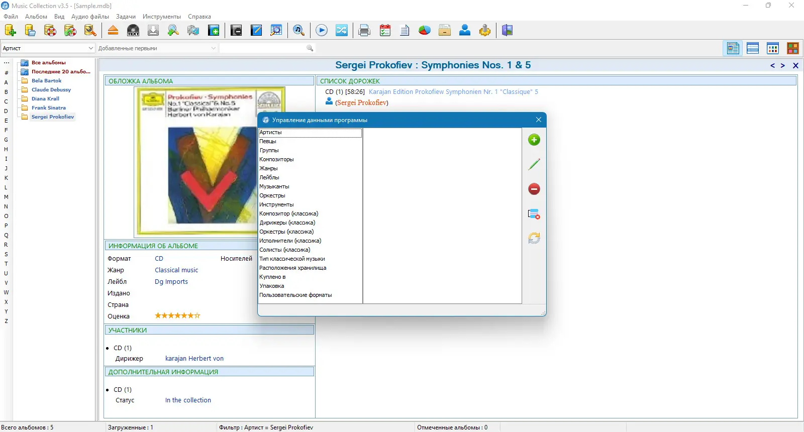 Music Collection — удобное приложение для систематизации музыкальной библиотеки на компьютере, позволяющее собирать, редактировать и просматривать информацию о треках, альбомах и исполнителях. Программа поддерживает автоматическое распознавание файлов, интеграцию с интернет-базами данных и экспорт сведений в HTML. С её помощью можно быстро находить нужные композиции, управлять обложками, текстами песен и дополнительной информацией.