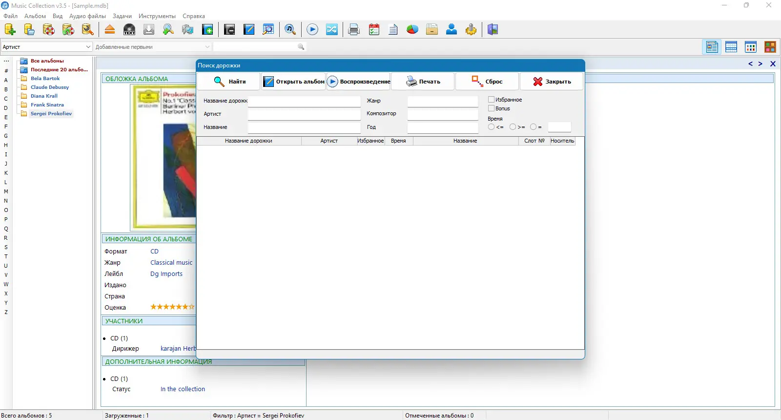 Использование Music Collection интуитивно понятно даже новичку. После запуска нужно добавить папки с музыкальными файлами, после чего программа автоматически начнёт сканирование и распознавание. Для каждого найденного альбома можно включить загрузку обложки, текстов песен и информации об исполнителе. Поиск осуществляется по различным критериям — по названию, жанру, году, исполнителю или даже по тексту песни. В режиме просмотра альбома доступен переход к управлению артистами, а также прослушивание трека прямо в окне поиска.