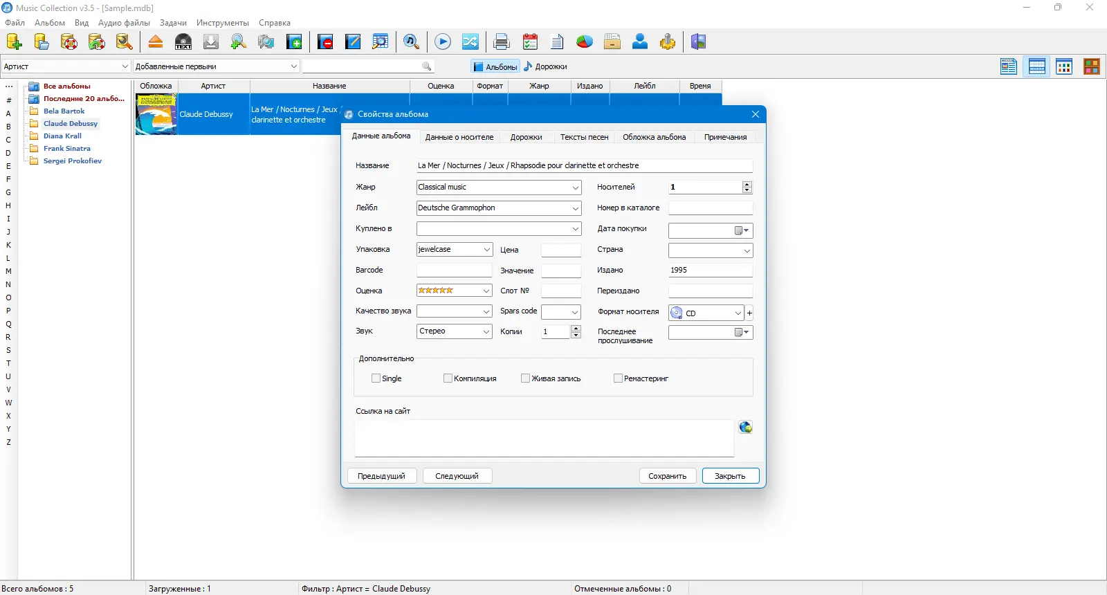Music Collection предлагает широкие возможности для организации музыки, но при этом сохраняет простоту в использовании. Программа подходит как для начинающих пользователей, так и для коллекционеров, стремящихся к максимальной детализации. Автоматизация рутинных задач, таких как ввод данных и поиск обложек, значительно экономит время.