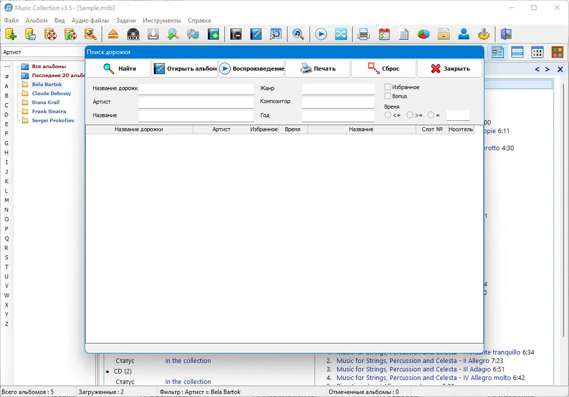 Music Collection — это удобное приложение для систематизации и управления музыкальной библиотекой на компьютере. Программа позволяет собирать, редактировать и просматривать информацию о треках, альбомах и исполнителях с поддержкой автоматической загрузки данных из интернета. С её помощью можно быстро находить нужные композиции, экспортировать сведения и настраивать отображение коллекции по своему вкусу.