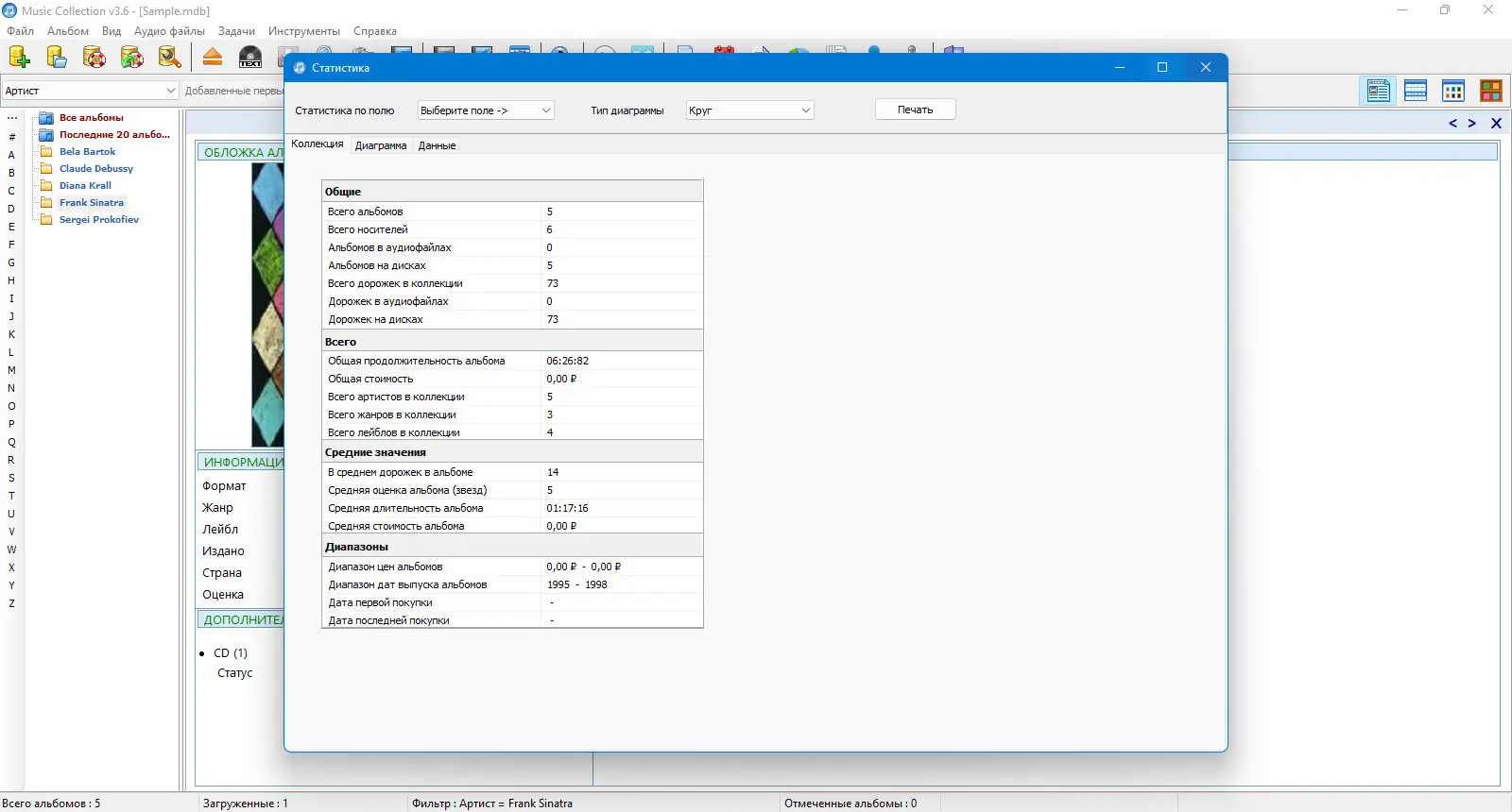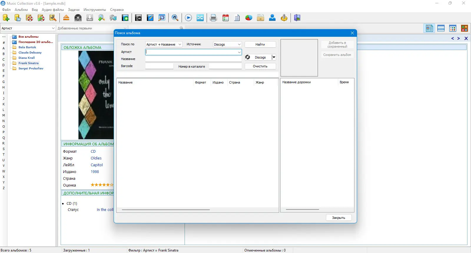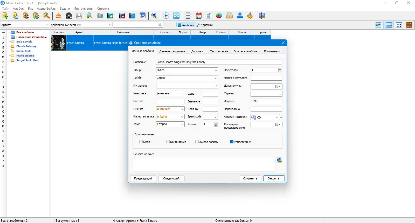 Music Collection — это удобное приложение для систематизации и управления музыкальной библиотекой на компьютере. Программа позволяет создавать подробные описания альбомов, редактировать метаданные треков, искать композиции по множеству критериев и автоматически получать информацию из интернета. С её помощью музыкальная коллекция становится структурированной, легко доступной и визуально привлекательной.