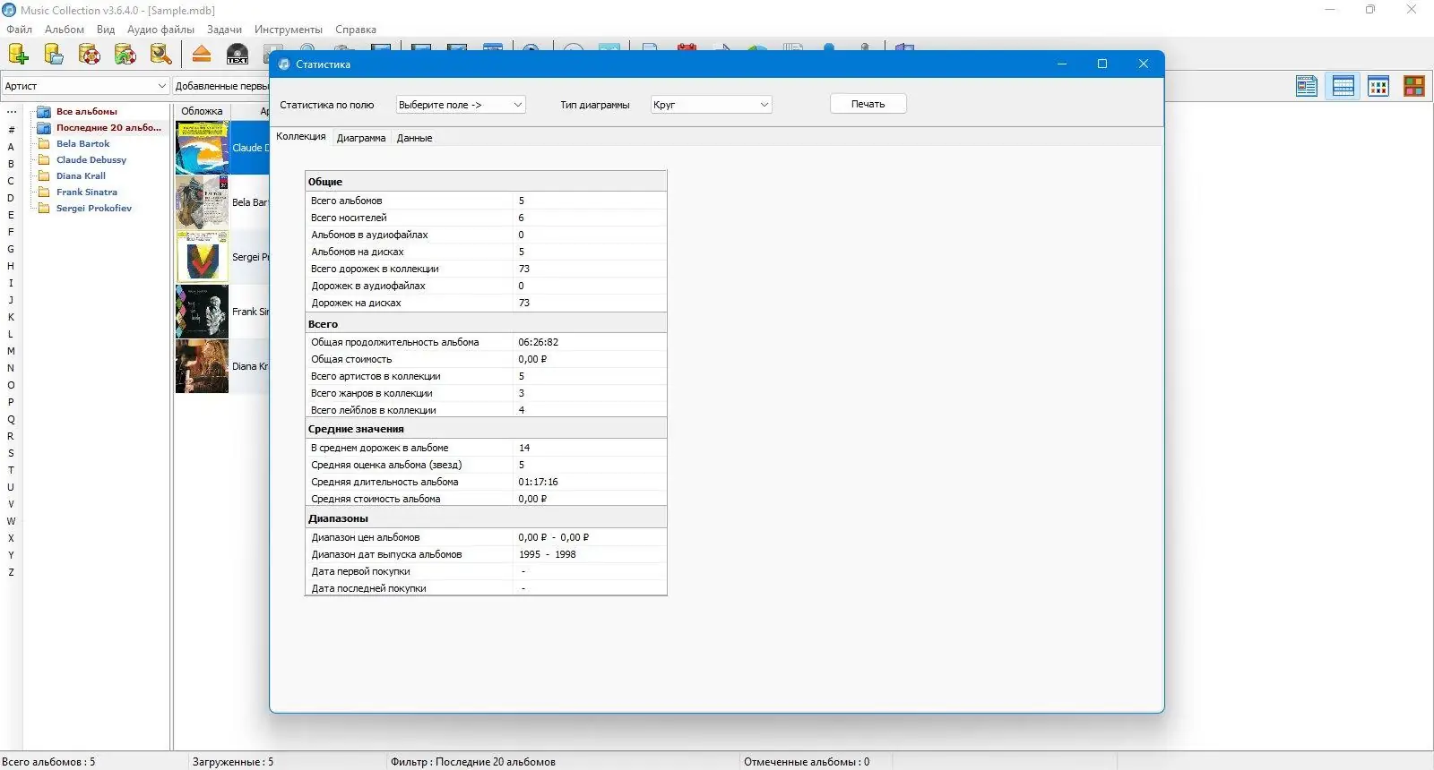 Music Collection разработана для тех, кто хочет привести свою музыкальную библиотеку в порядок и иметь к ней быстрый доступ. Программа работает с файлами разных форматов, включая mp3, flac, wav и m4a, и позволяет создавать подробные записи о каждом альбоме. Информация может вводиться вручную или подтягиваться из сети, минимизируя усилия пользователя. Поддержка баз данных в формате Microsoft Access обеспечивает надёжное хранение данных. Каждый альбом можно дополнить обложкой, списком треков и даже текстами песен.