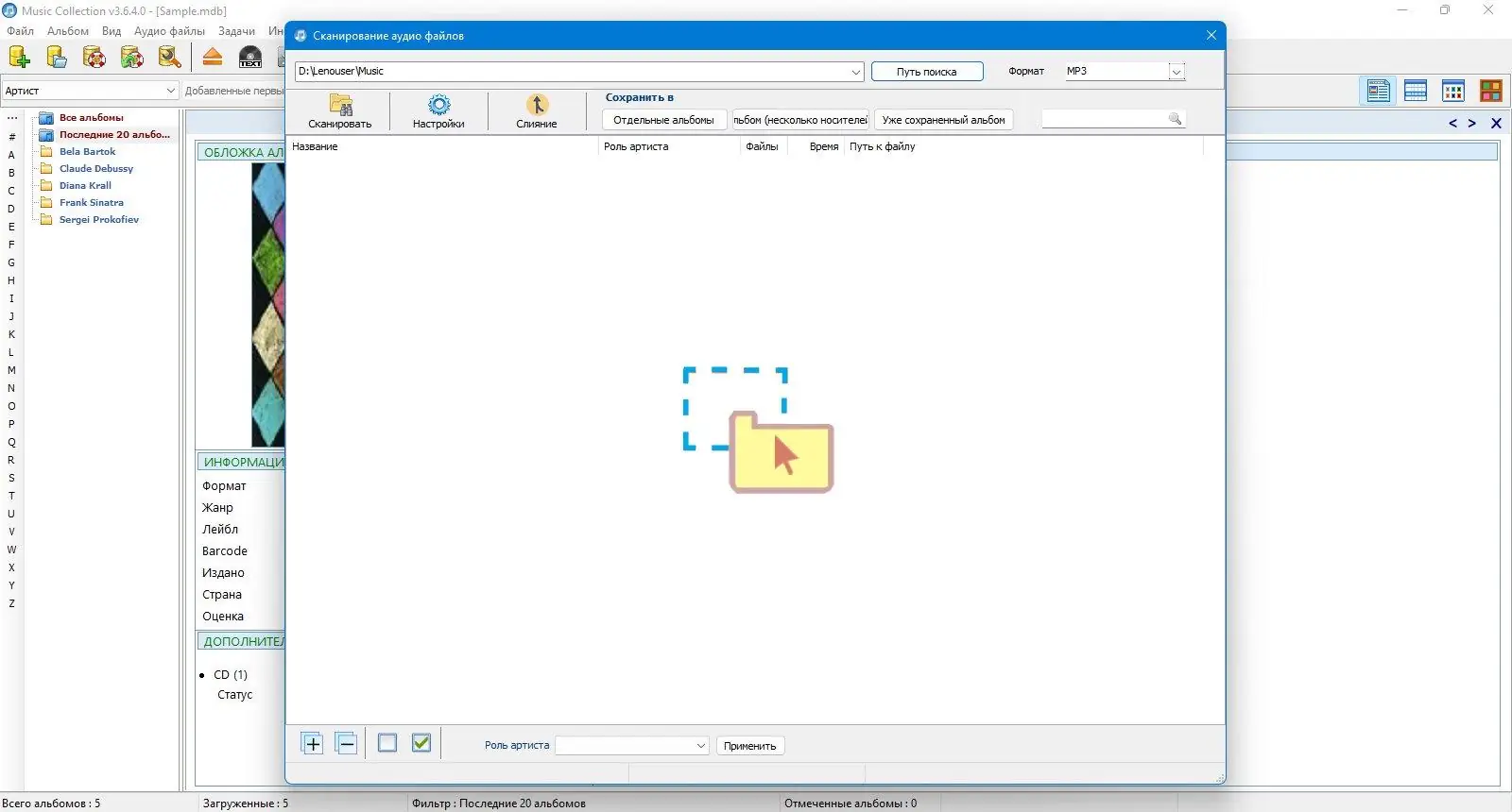 После запуска программы пользователь может начать с добавления папок, содержащих музыкальные файлы. Система автоматически сканирует содержимое и распознаёт типы файлов, извлекая теги. При необходимости данные корректируются вручную. Для каждого альбома можно выбрать обложку, добавить описание, указать композиторов и жанры. В версии 3.6.4.0 улучшена работа с тегами m4a, что делает распознавание более точным. Группировка альбомов настраивается через параметры, позволяя организовать коллекцию по году, исполнителю или стилю. В портативной версии не требуется установка — достаточно распаковать архив и запустить исполняемый файл. Также реализована возможность добавлять несколько исполнителей к неклассическим альбомам, что особенно полезно для сборников и ремиксов.