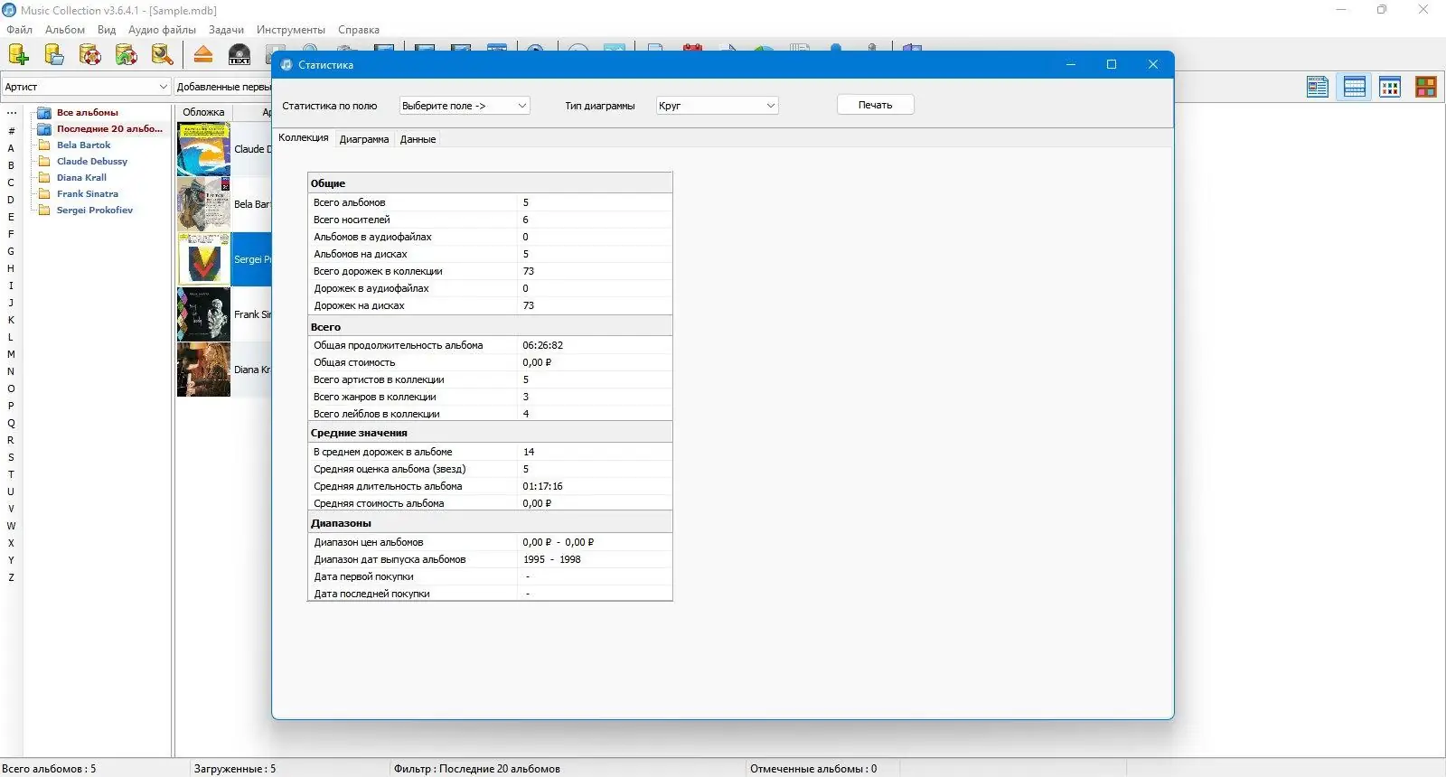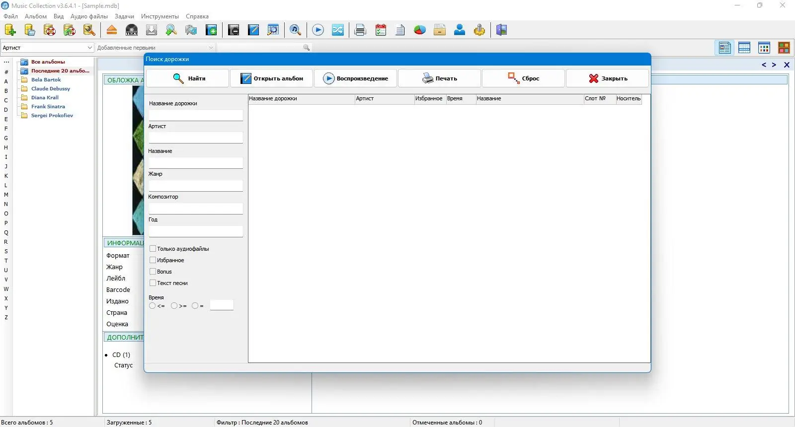 Music Collection — это удобное приложение для систематизации и просмотра музыкальной библиотеки на компьютере. Программа позволяет собирать, редактировать и упорядочивать информацию о треках, альбомах и исполнителях с автоматическим импортом данных из интернета и поддержкой множества аудиоформатов.