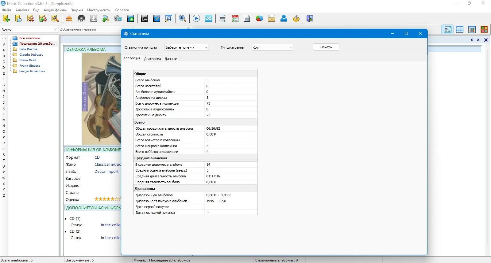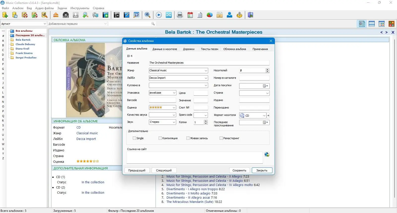 Music Collection — удобное приложение для систематизации музыкальных файлов на компьютере. Программа помогает создавать персональные коллекции, управлять метаданными треков и получать дополнительную информацию из интернета. С её помощью можно быстро находить нужные альбомы, редактировать описания и сохранять данные в удобном формате. Интерфейс поддерживает индивидуальную настройку, а функционал охватывает широкий спектр задач по ведению музыкальной библиотеки. Работа с тегами, обложками и текстами песен становится простой и интуитивной. Программа подходит как для начинающих пользователей, так и для коллекционеров, стремящихся к идеальному порядку в медиатеке.
