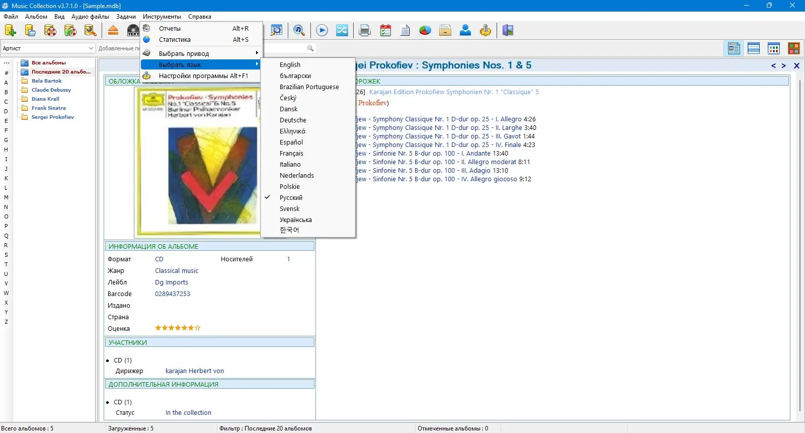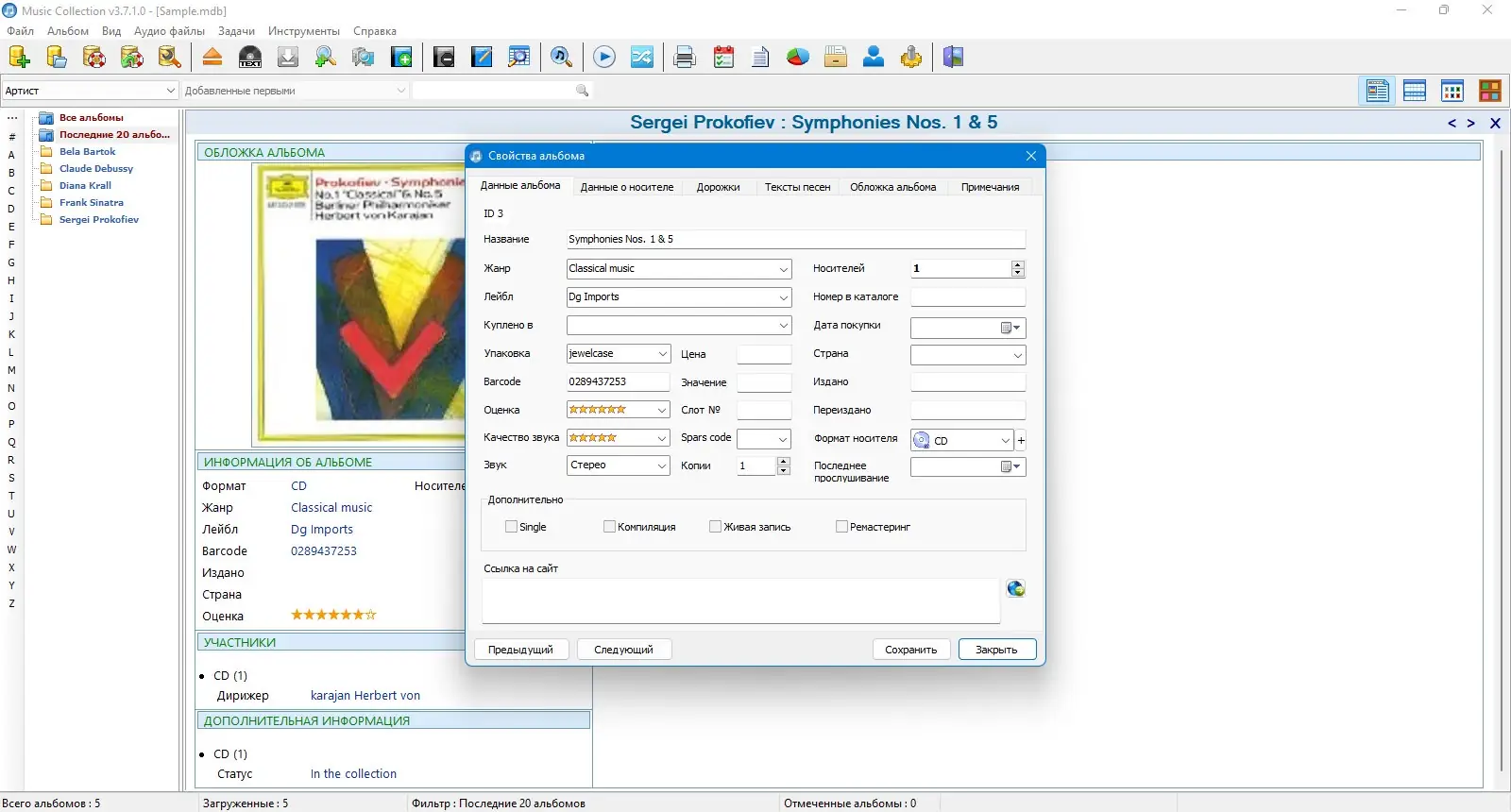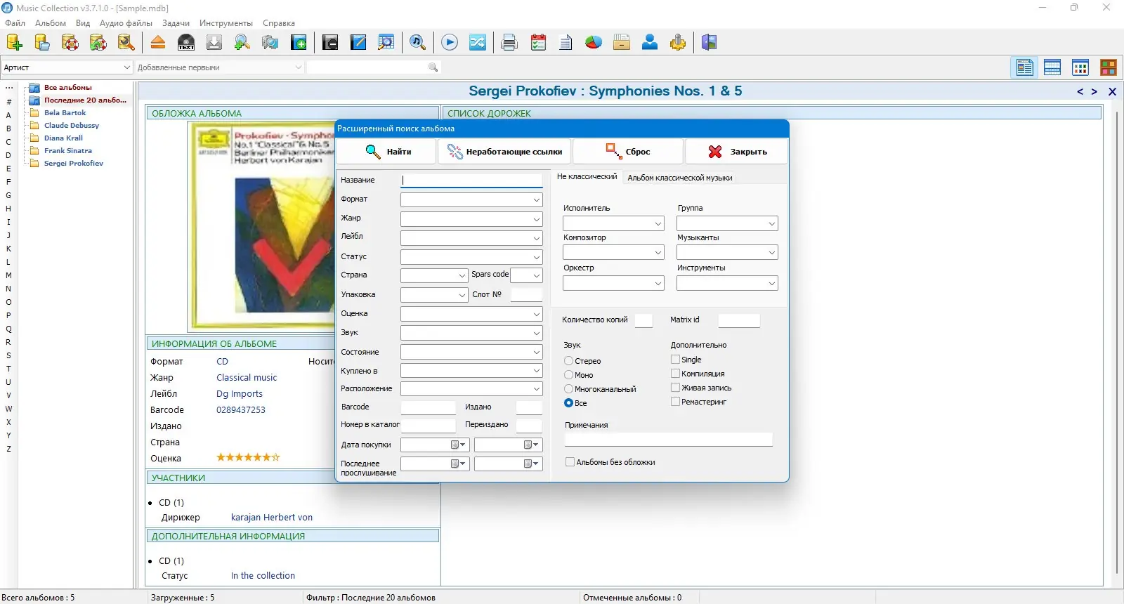 Music Collection — это удобное приложение для систематизации музыкальной библиотеки на компьютере. Программа позволяет создавать детализированные описания альбомов, редактировать метаданные треков и получать информацию из интернета. Благодаря продуманному интерфейсу и широкому функционалу, пользователь может легко управлять коллекцией любого объёма.