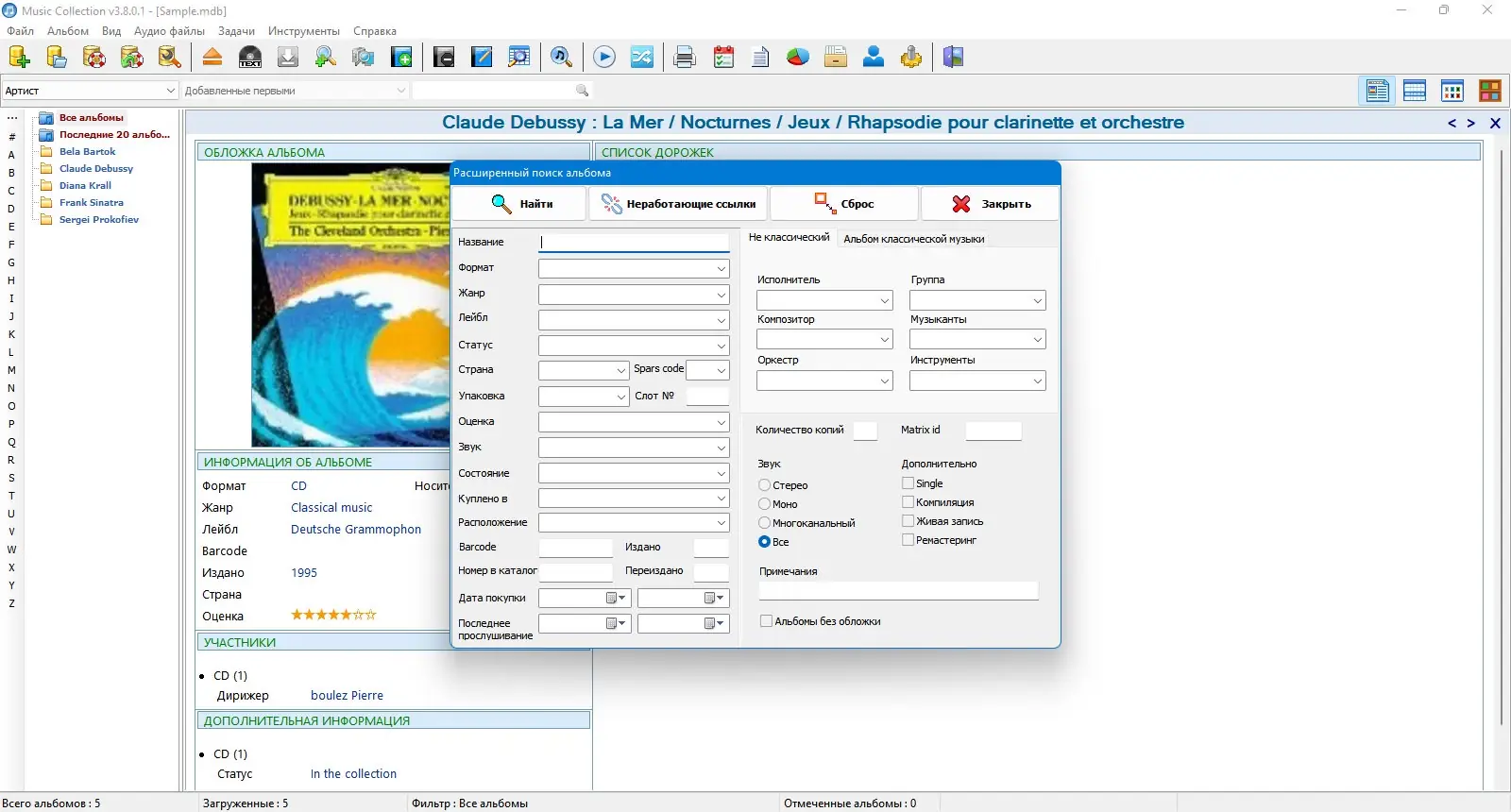 Music Collection — это программное обеспечение, предназначенное для ведения персональной музыкальной базы данных. Оно ориентировано на пользователей, которые ценят порядок в цифровой коллекции и хотят иметь исчерпывающую информацию о каждом треке и альбоме. Программа поддерживает создание баз данных в формате Microsoft Access и позволяет управлять неограниченным количеством музыкальных коллекций. Она распознаёт все распространённые форматы аудиофайлов, включая mp3, flac, wav, а также извлекает данные с компакт-дисков. Каждый альбом может содержать полную информацию: список дорожек, тексты песен, год выпуска, жанр и примечания. Пользователь может выбрать обложку, указать исполнителя и композитора, а также добавить дополнительные сведения.