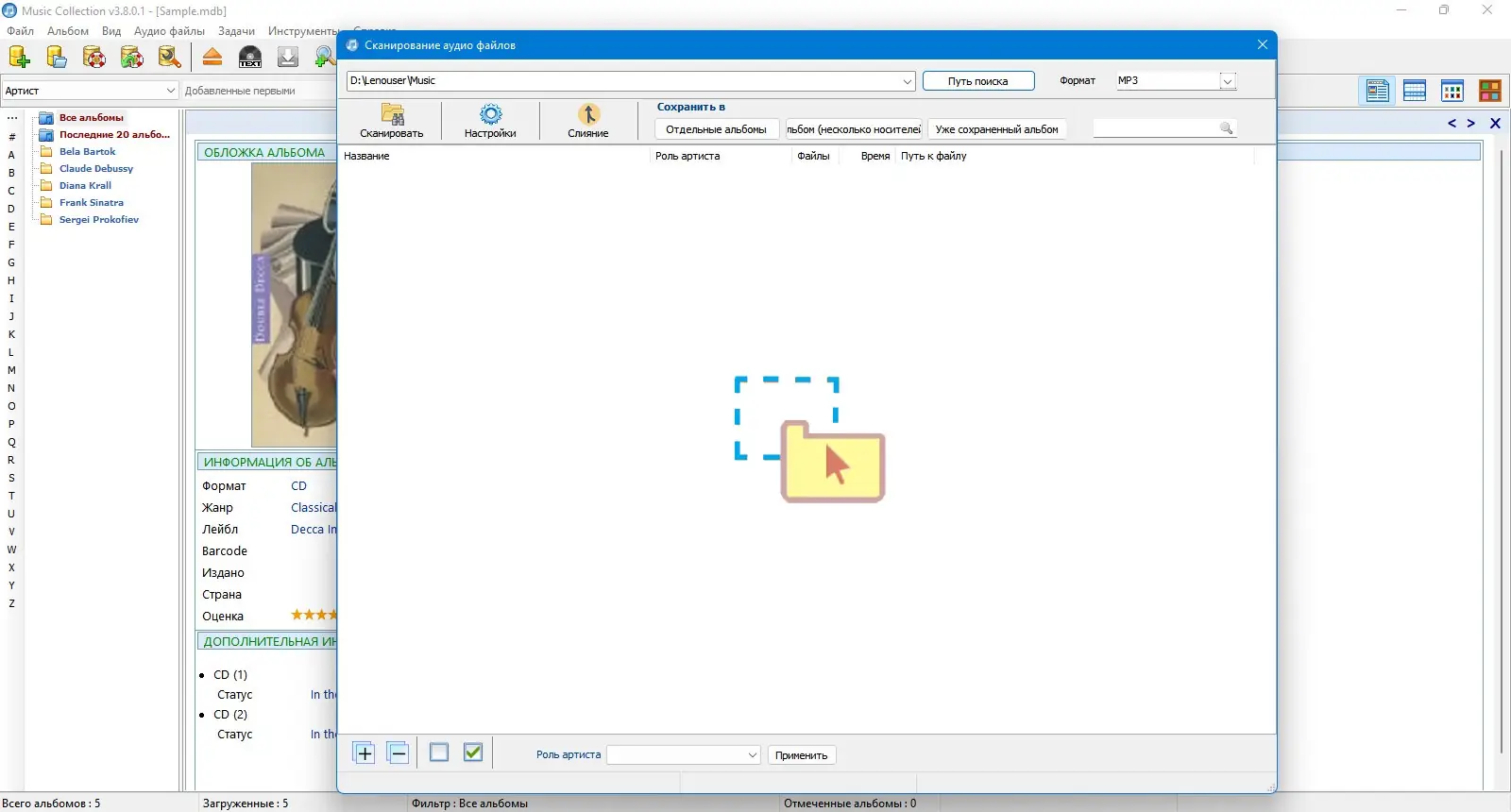 Music Collection — удобное приложение для систематизации музыкальной библиотеки на компьютере. Программа позволяет создавать подробные описания альбомов, редактировать метаданные треков и автоматически извлекать информацию из интернета, включая обложки и тексты песен. Управление коллекцией осуществляется с помощью гибкого интерфейса с поддержкой скинов и возможностью экспорта данных. С её помощью музыкальные файлы любого формата превращаются в упорядоченную базу с полной информацией по каждому альбому, включая такие детали, как битрейт и данные исполнителей.