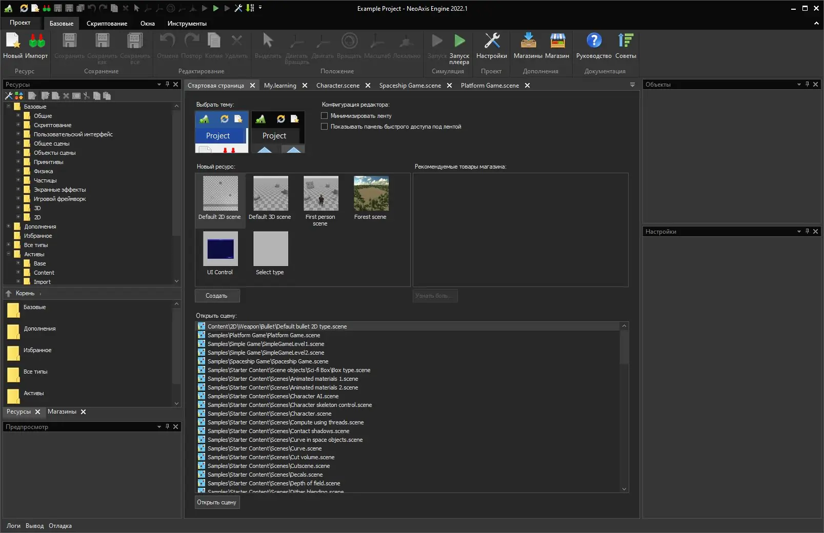 - Встроенный редактор ресурсов позволяет управлять материалами, физическими моделями, частицами и пользовательским интерфейсом в единой среде.