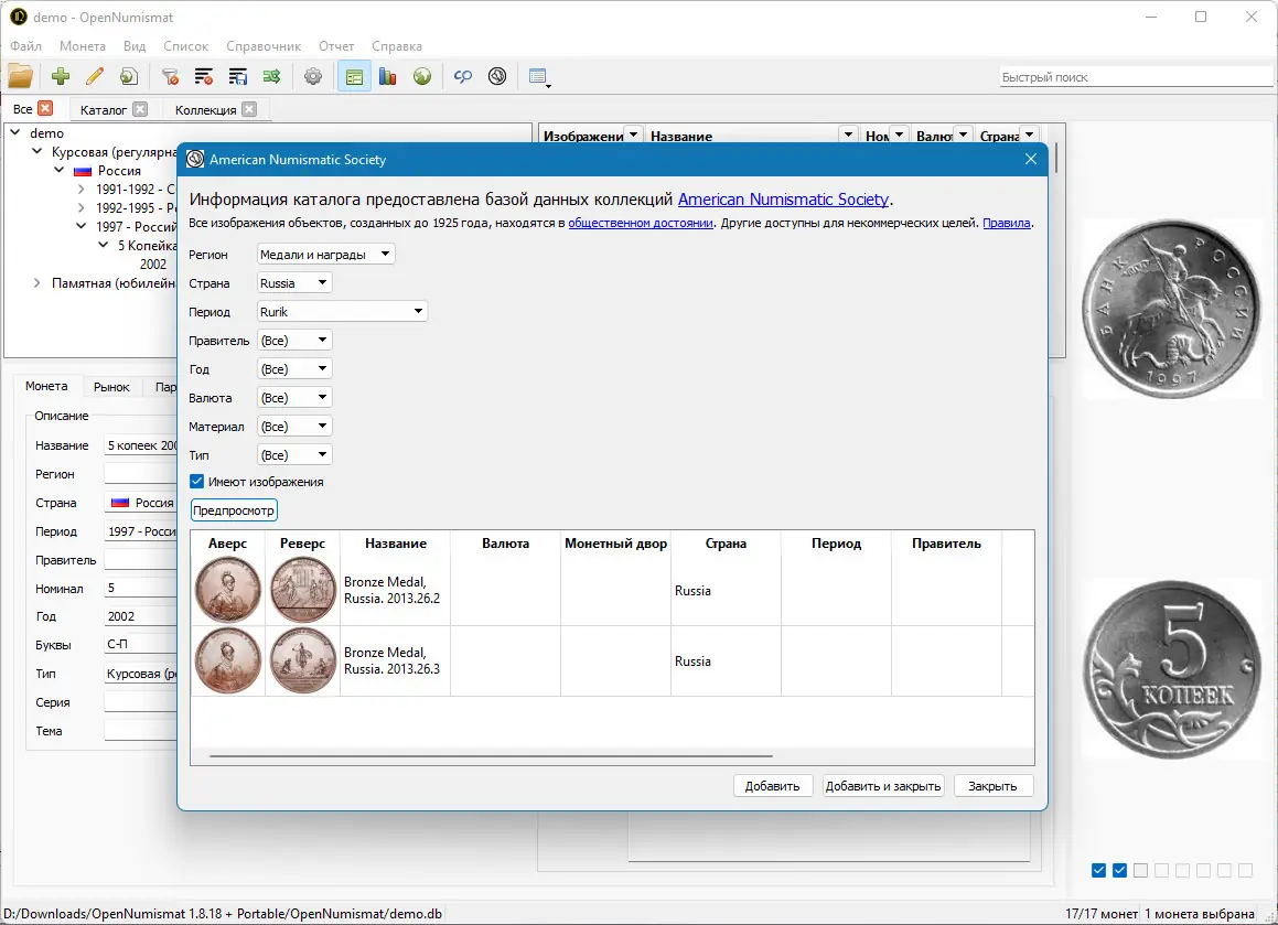 - Программа включает более 70 настраиваемых полей для описания монет, включая вес, диаметр, пробу металла, исторический период и страну выпуска.