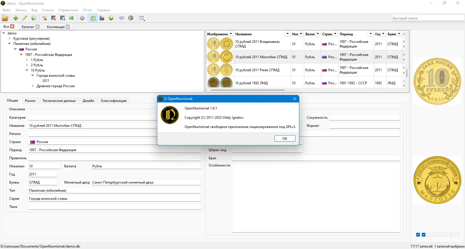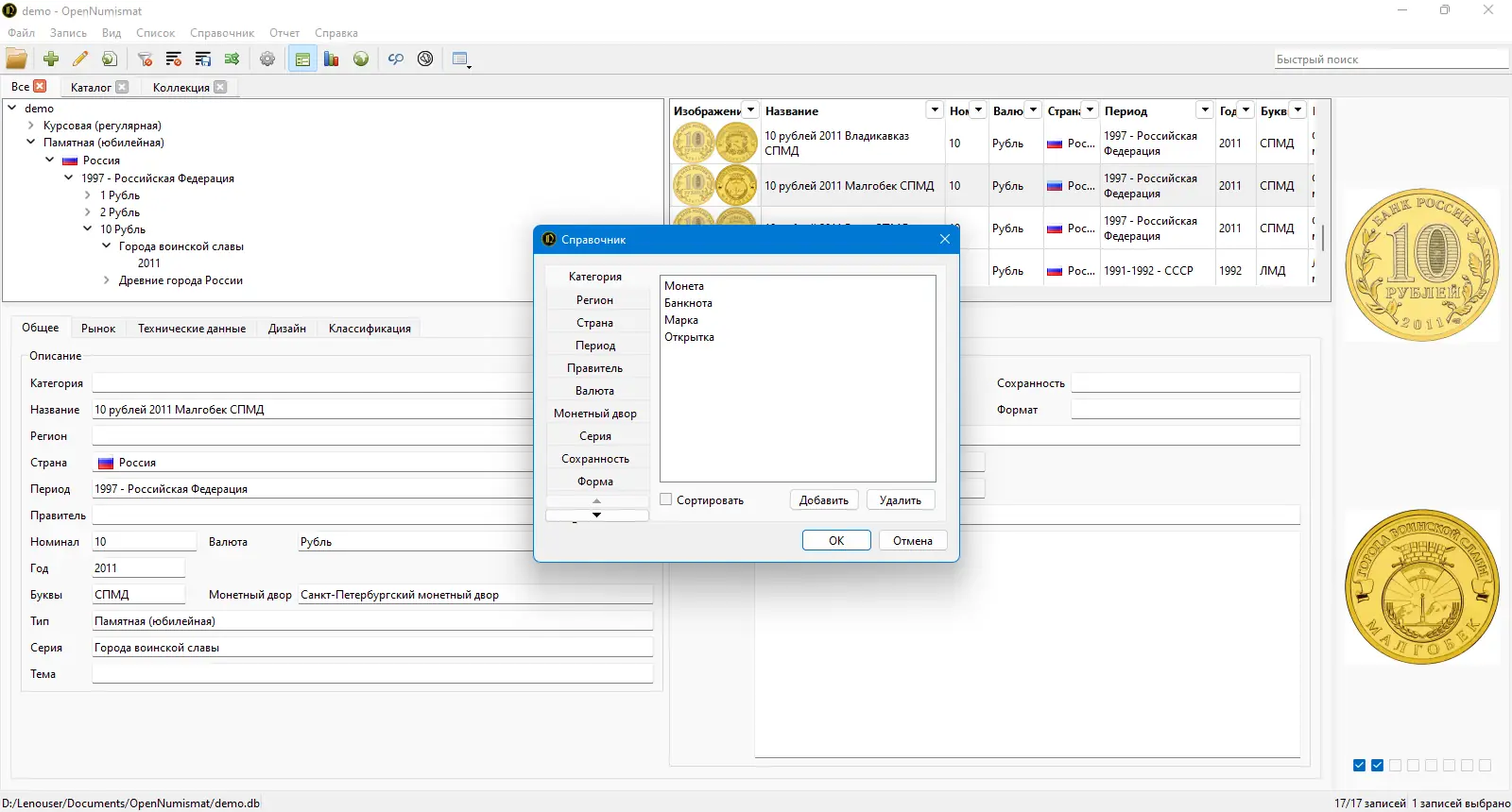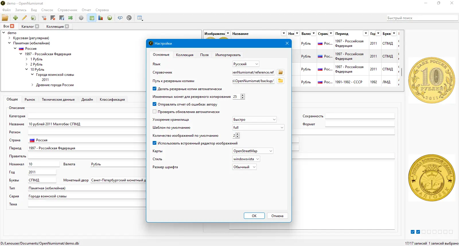 - OpenNumismat не требует установки внешних баз данных — вся информация хранится в локальной SQLite-базе, что обеспечивает стабильность и автономность работы