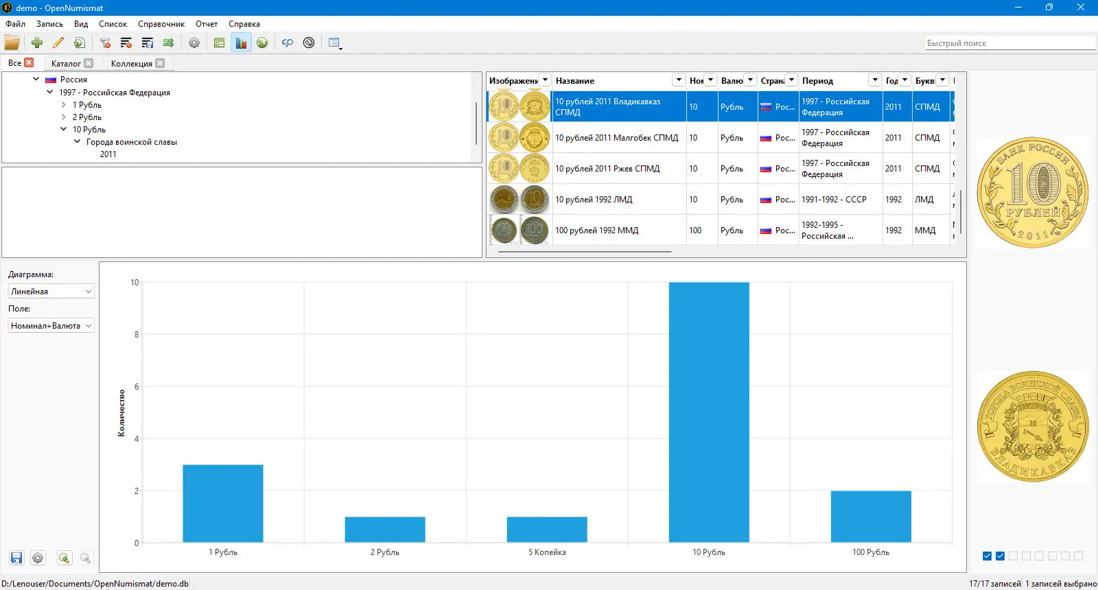 Программа позволяет вести статистику по коллекции: отслеживать общую стоимость, количество экземпляров по странам или периодам, долю редких монет. Все эти данные можно визуализировать в виде диаграмм или включить в отчёты. Встроенные инструменты помогают анализировать динамику пополнения коллекции и оценивать её текущее состояние.