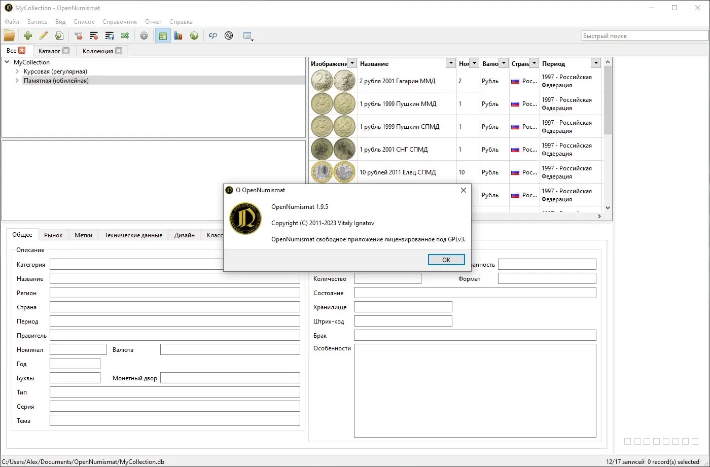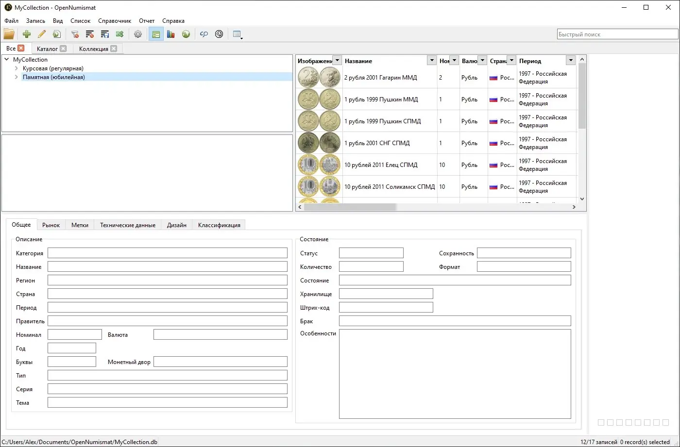 OpenNumismat — это бесплатное кроссплатформенное приложение для ведения цифровой коллекции монет, банкнот и других нумизматических предметов. Программа позволяет детально описывать каждый экземпляр, добавлять изображения, отслеживать стоимость и состояние, а также формировать отчёты и статистику. Поддержка импорта из популярных источников делает интеграцию существующих данных быстрой и удобной.