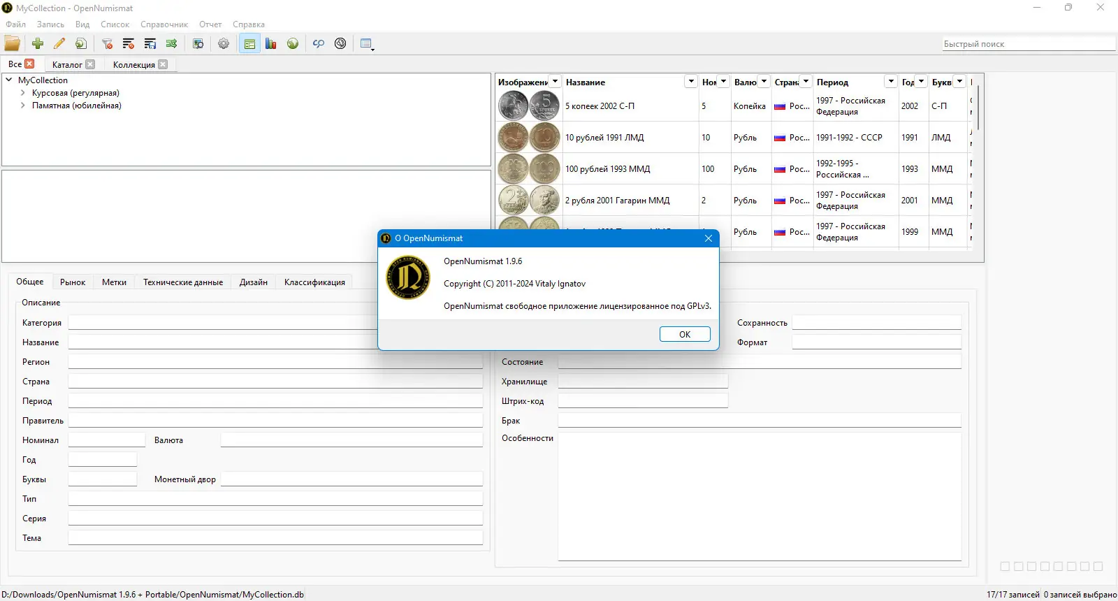 Программа доступна для бесплатного скачивания в стационарной и портативной версиях. Портативная сборка не требует установки и может использоваться на любом компьютере без внесения изменений в реестр. Все данные хранятся в локальной базе, что гарантирует конфиденциальность и целостность информации. Версия OpenNumismat-1.9.6 включает все актуальные функции и исправления.
