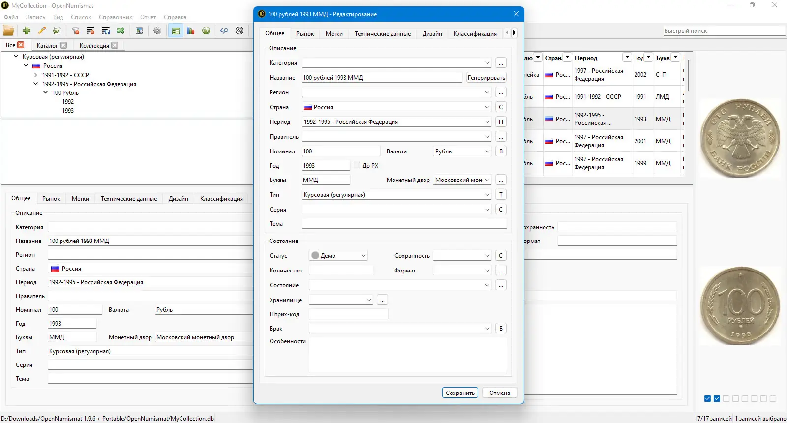 - Программа поддерживает более 70 настраиваемых полей, включая технические характеристики, состояние монеты, даты выпуска и обращения, а также данные о покупке и продаже.