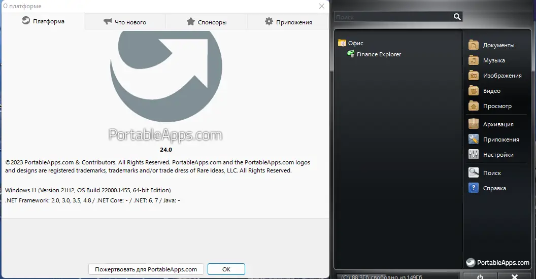 PortableApps.com Platform доступна для загрузки в портативном формате .paf, что гарантирует автономность и безопасность использования. Версия 24.0, выпущенная в январе 2023 года, включает поддержку Windows on ARM, улучшенное определение шрифтов системы и новые функции интеграции с меню «Пуск» и панелью задач. Программа совместима с современными версиями Windows и поддерживает как 32-, так и 64-битные системы. Русский язык интерфейса включён по умолчанию.