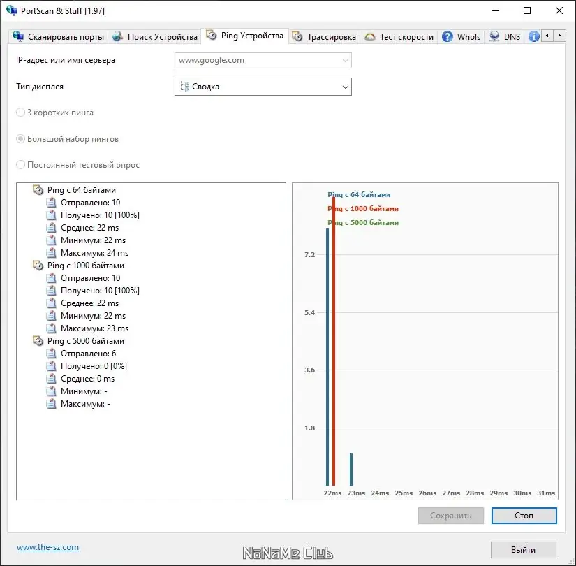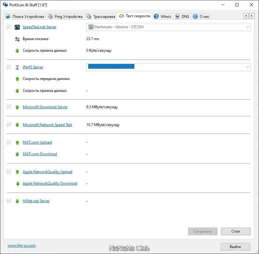 Запуск PortScan & Stuff не требует установки, особенно в случае использования портативной версии, которая работает непосредственно с USB-накопителя. После старта приложения необходимо запустить сканирование локальной сети, после чего программа отобразит список всех обнаруженных устройств. Каждое устройство можно исследовать отдельно: проверить открытые порты, выполнить пинг, трассировку или запрос Whois. Для оценки качества интернет-соединения используется встроенный инструмент проверки скорости, а результаты любого сканирования легко экспортируются для архивирования или анализа на другом устройстве.