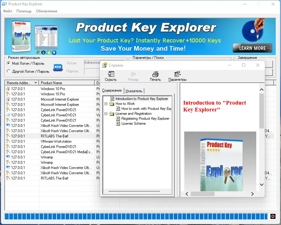 Product Key Explorer — это инструмент для поиска, расшифровки и сохранения лицензионных ключей установленных программ и операционных систем. Программа сканирует реестр Windows, обнаруживает данные о продуктах и предоставляет возможность экспортировать информацию в различные форматы. Поддерживает широкий перечень приложений, включая продукты Microsoft, графические редакторы, антивирусы и компьютерные игры.
