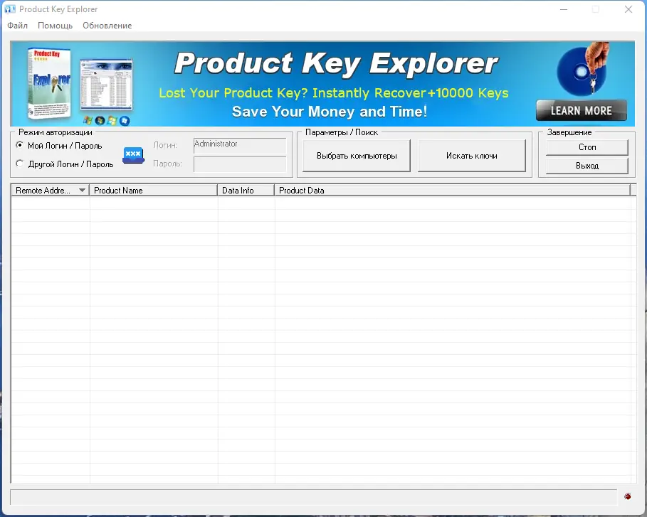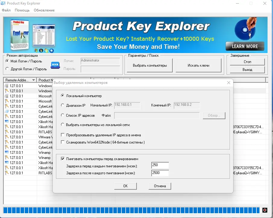 Запуск программы не требует сложной настройки — достаточно нажать кнопку «Find Keys», чтобы начать сканирование. После завершения поиска отобразится список всех найденных приложений с соответствующими ключами. Для сетевого доступа необходимо указать IP-адреса или загрузить текстовый файл с их списком, а при необходимости — ввести учетные данные администратора.