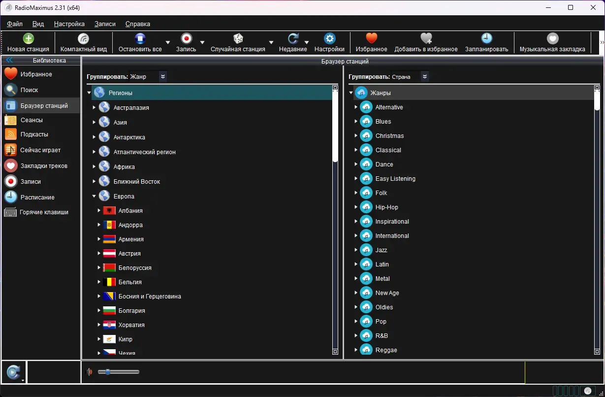 RadioMaximus — это мощный и удобный проигрыватель, предназначенный для прослушивания и записи потокового аудио с радиостанций со всего мира. Программа поддерживает одновременную работу с несколькими каналами и позволяет сохранять аудиоданные в популярных форматах, включая MP3, AAC, OGG, WMA и RAW. Благодаря интуитивному интерфейсу и широкому функционалу, пользователи могут легко настроить автоматическую запись любимых треков или целых эфиров, не требуя дополнительных усилий после первоначальной настройки.