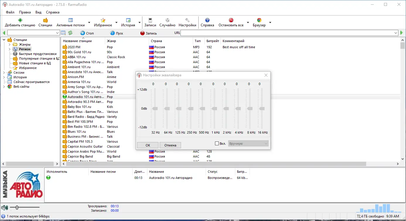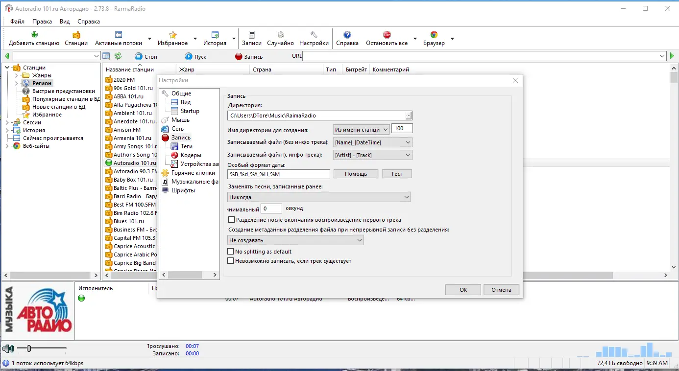 После запуска приложения пользователь получает доступ к древовидной структуре радиостанций, где можно быстро переключаться между жанрами или регионами. Для прослушивания достаточно дважды щёлкнуть по нужной станции, после чего начнётся воспроизведение с отображением текущего трека. Запись эфира настраивается через контекстное меню — можно выбрать конкретный промежуток времени или задать расписание. Программа также позволяет настроить условие автоматической записи при появлении определённой песни в эфире, что удобно для сбора любимых композиций.