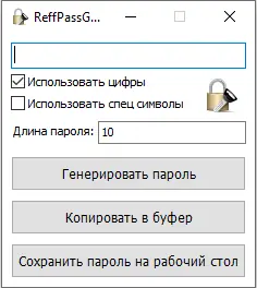 ReffPassGen — это компактное приложение для быстрой генерации надёжных паролей с возможностью копирования в буфер обмена или сохранения на рабочем столе. Программа работает на русском языке и не требует установки в портативной версии, что делает её удобной для использования на любом устройстве.