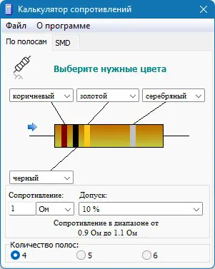 Интерфейс Resistor интуитивно понятен: для определения параметров достаточно последовательно выбрать цвета колец в выпадающих списках. Первые полосы определяют значащие цифры и множитель, после чего программа вычисляет сопротивление. Допуск, указанный пятым кольцом, позволяет понять, насколько реальное значение может отличаться от номинала. Для SMD-компонентов, таких как chip резисторы формата 0603, вводится трёх- или четырёхсимвольный код, и система автоматически интерпретирует его. При работе с pull up цепями или low-level схемами точное знание сопротивления критично, и Resistor помогает избежать ошибок при подборе элементов.