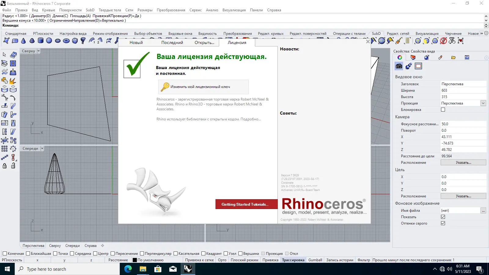 После установки приложения необходимо настроить параметры запуска и локализации. Для предотвращения проверки лицензии следует заблокировать соединение программы с серверами через файл hosts или брандмауэр. Затем запускается активатор RhinoActivator.exe, после чего система сообщает о успешной активации.
