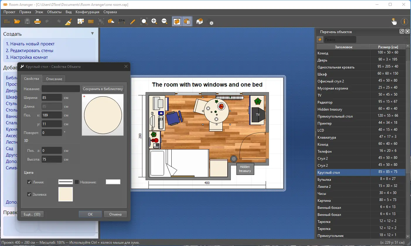 Room Arranger — это удобное приложение для проектирования интерьеров, позволяющее визуализировать расстановку мебели, изменять размеры объектов и создавать 3D-модели помещений. Программа подойдёт как для домашнего использования, так и для решения задач в области дизайна интерьера. Результат можно посмотреть в трёхмерном виде и опубликовать в интернете.